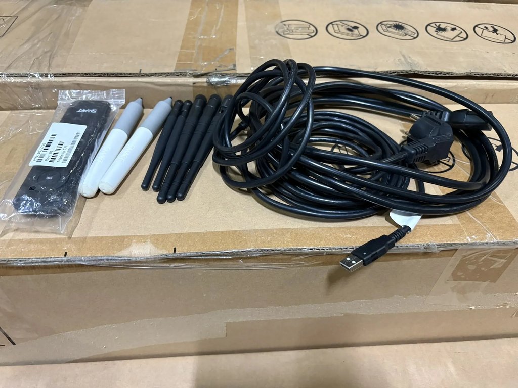 Упаковка вскрывалась , рваная, вся в скотче. Оборудование использовалось. .в комплекте: кабель питания, стилусы, пульт.